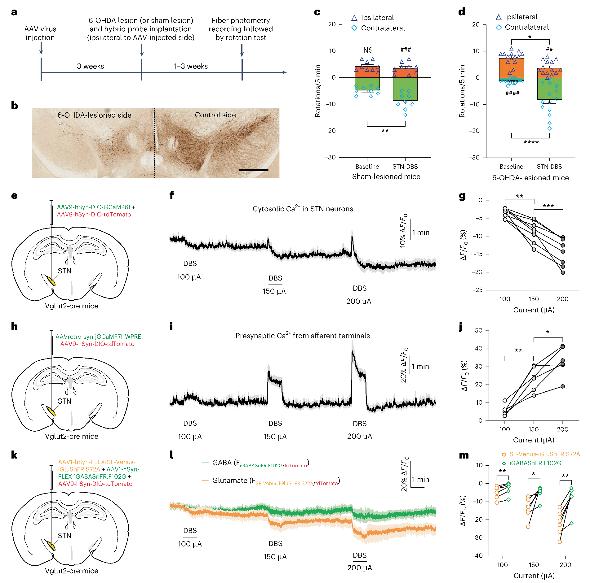 作者发现DBS期间,STN神经元在短暂激活后会持续受到抑制,且轴突末梢的活动同样受到抑制。作者进一步研究了DBS对传入末梢活动和局部神经递质释放的影响,发现谷氨酸能和γ-氨基丁酸能轴突末梢在DBS期间强劲激活,DBS导致局部神经递质释放减少,其中谷氨酸的减少幅度大于γ-氨基丁酸,从而使兴奋/抑制平衡向抑制方向倾斜。接下来作者探究了上述改变是否同样存在与帕金森病小鼠中,使用6-OHDA建立PD小鼠模型并重复了上述实验,并在PD小鼠中观察到与正常小鼠相同的DBS诱导效应:即影响STN神经元、传入末梢、以及谷氨酸和γ-氨基丁酸水平,表明DBS诱导的行为效应机制与疾病状态无关。因此作者提出假设:DBS会持续激活支配丘脑下核神经元的传入纤维,导致神经递质释放减少,其中谷氨酸释放的减少幅度大于γ-氨基丁酸,导致局部兴奋/抑制比值向抑制方向的转变,最终抑制了丘脑下核神经元的活动,并且DBS可能通过抑制PD诱导的STN神经元活动发挥治疗作用。