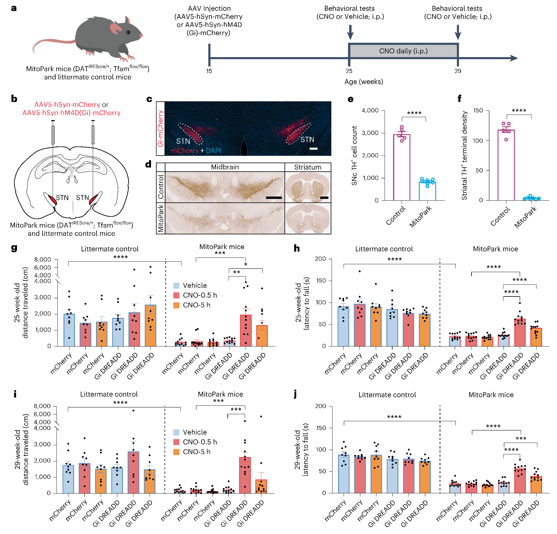为了进一步评估“化学遗传DBS”在类似于人类患者中的治疗功效,作者将AAV5-hSyn-hM4D(Gi)-mCherry或AAV5-hSyn-mCherry注射到MitoPark小鼠(PD模型小鼠)和对照小鼠STN,并进行旷场实验和转棒测试。发现MitoPark小鼠表现出严重的运动缺陷,在露天试验中运动活动减少,在旋转棒试验中保持平衡的能力较差,类似于在晚期PD患者中观察到的症状。单CNO给药完全挽救了AAV5-hSyn-hM4D(Gi)-MitoPark小鼠在开放场和旋转棒试验中的缺陷。接下来,作者评估长期治疗后“化学遗传学DBS”治疗效果的潜在脱敏作用,发现4周的慢性CNO每日治疗不会导致其治疗效果脱敏。最后,作者直接比较了“化学遗传学DBS”和电刺激DBS之间的治疗效果,结果表明,这种“化学遗传DBS”治疗可以等于或比电刺激DBS治疗更有效。